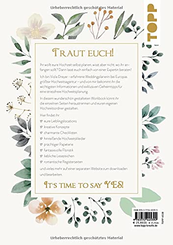 Du wünscht dir deine ganz persönliche und unvergessliche Traumhochzeit? Die Autorin und erfahrene Hochzeitsplanerin Viola Dreyer zeigt dir in diesem Hochzeitsplaner alles, was du für den schönsten Tag in deinem Leben wissen musst – von der Auswahl des richtigen Kleides, der Location und der Ringe bis hin zu Catering, Gästelisten und einem bewährten Finanzplan. Darüber hinaus verrät sie dir ihre ganz persönlichen Tipps & Tricks und zeigt dir ihre beliebtesten DIY-Dekoideen. Alle Inhalte und Checklisten sind heraustrennbar, damit du dir deinen individuellen Hochzeitsordner zusammenstellen kannst. Let‘s get married!